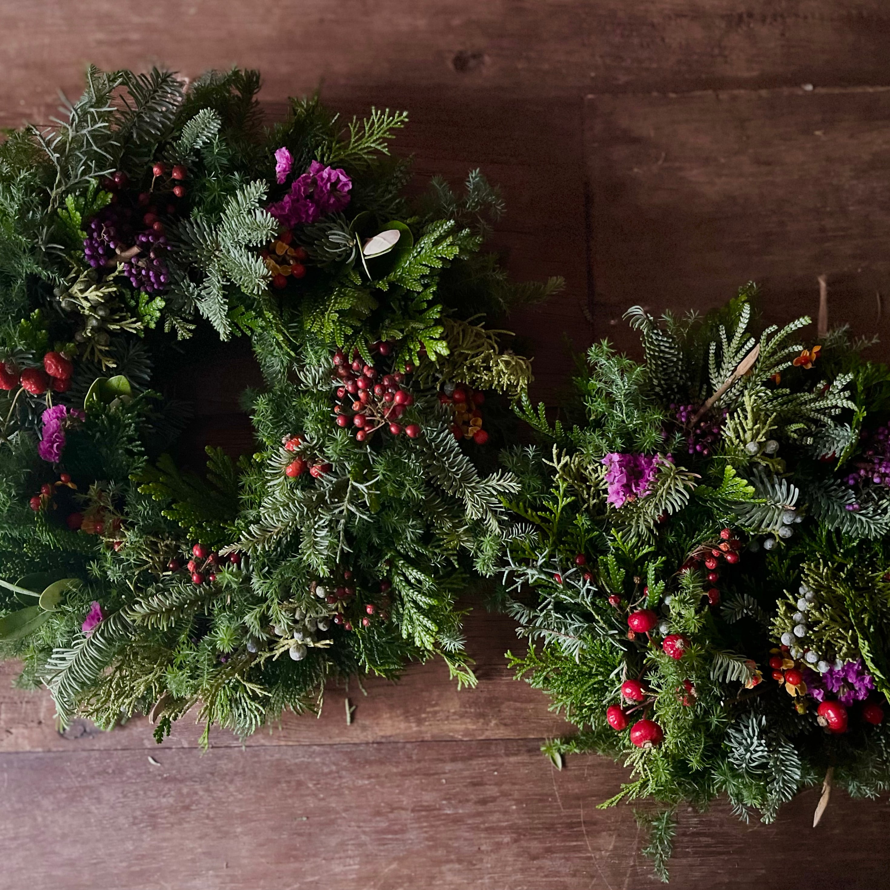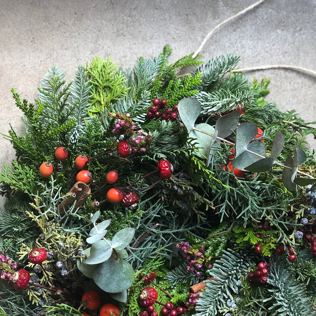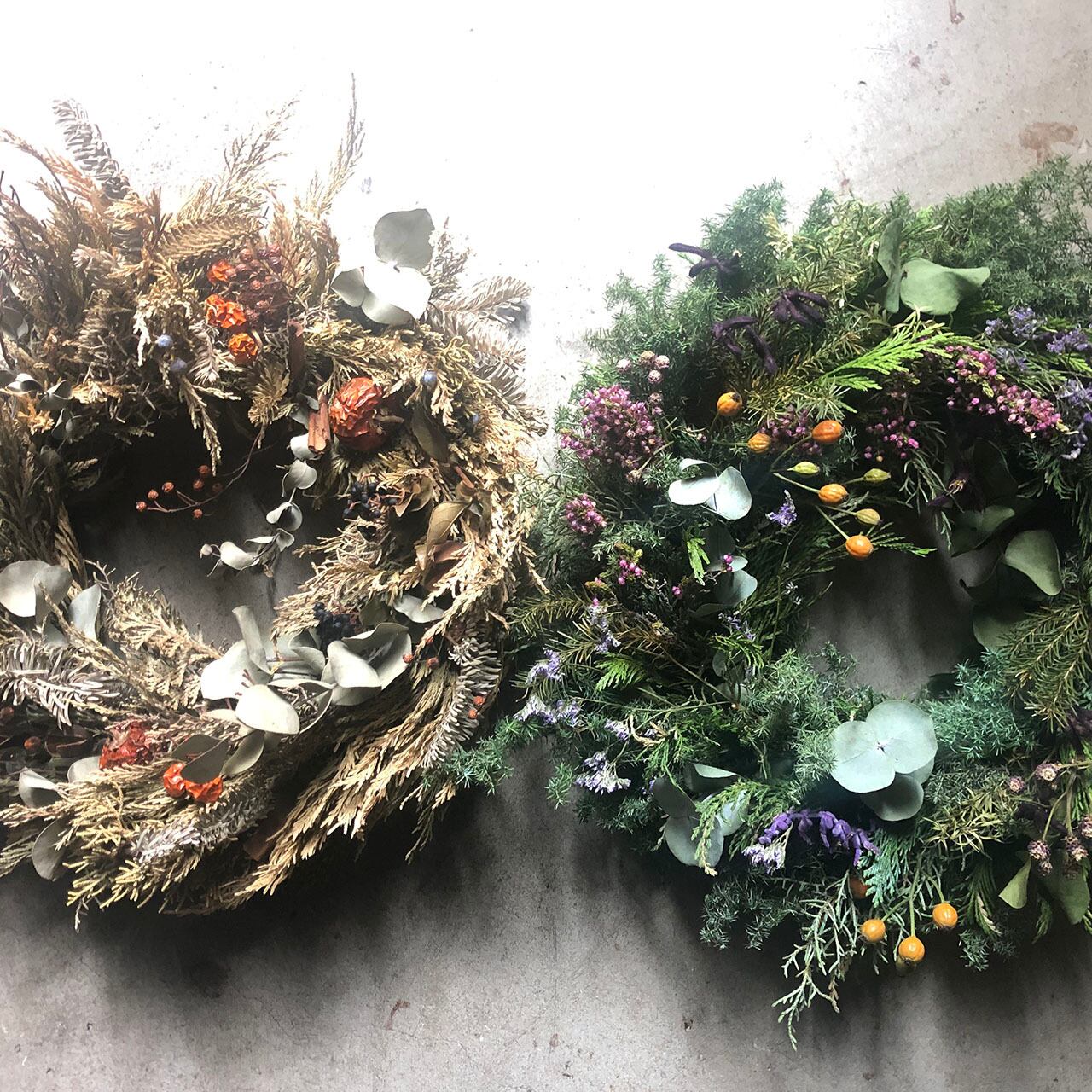 生のグリーンとドライフラワーのリースです。